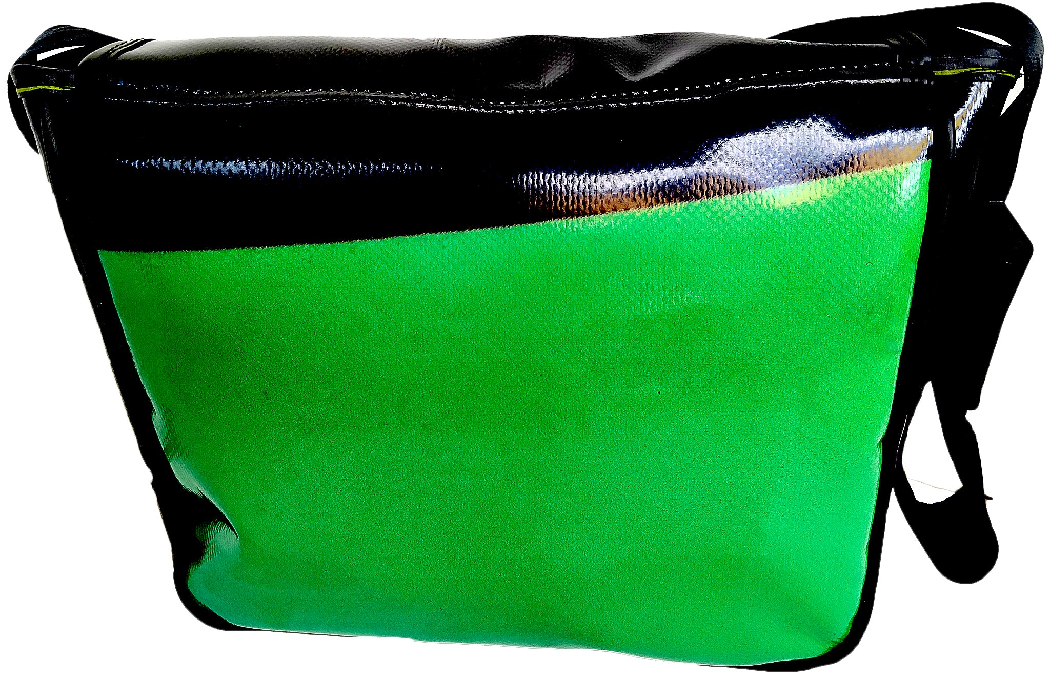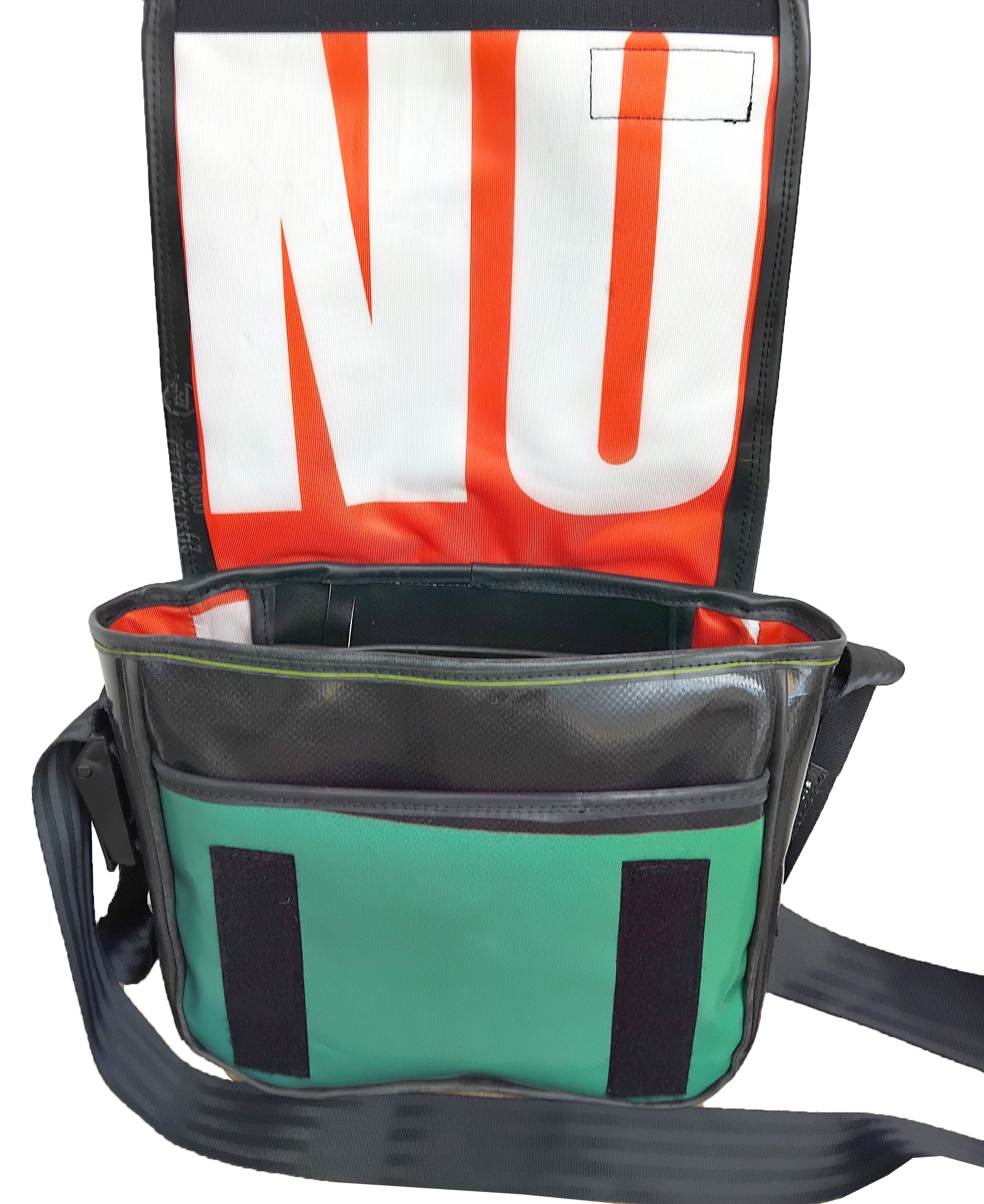 The recycled ‘Benzo’ is perfect for day to day running around, fits all you need, Ipad, phone, wallet, a book and small drink bottle. Its one-of-a-kind, unique in colour and design. It’s durable, comfortable and weather proof for protecting your belongings. The bag may bear tell-tale marking of its adventurous previous life as a truck curtain. This defines its unique character as it carries its battle scars into its next life with you!